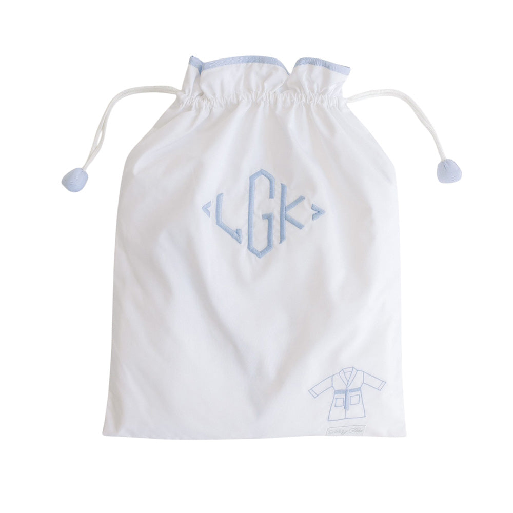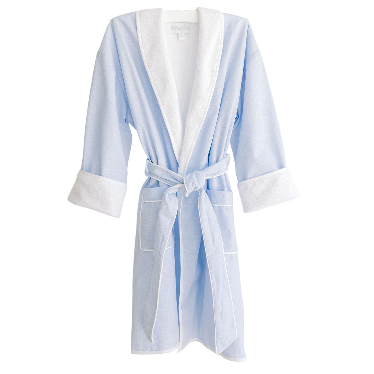Blue pinstripe cotton fabric and thin terrycloth lining.