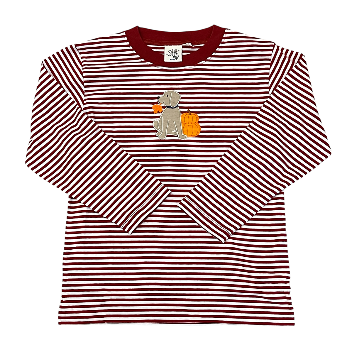 Lab with Pumpkin and Autumn Leaf on Burgundy Stripe Shirt by Luigi