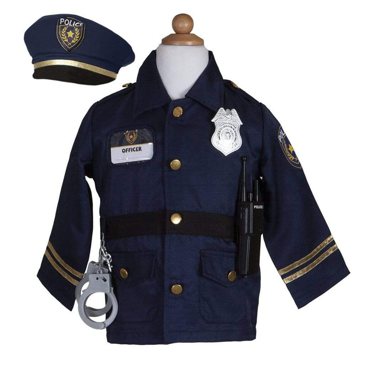 Police officer set includes: Jacket, Hat, Handcuffs, Walkie Talkie, Badge, and Name Badge.