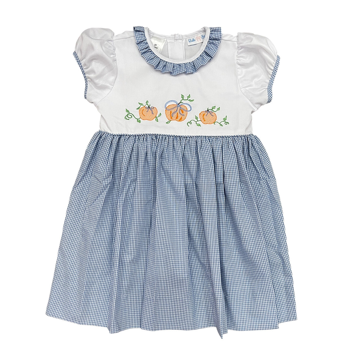 Pumpkins Embroidered on Blue Check Dress by LuLu BeBe