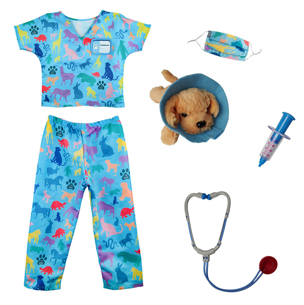 Veterinarian Set includes Scrubs: Shirt and Pants, Mask, Plush Puppy with removable Cone, Syringe with working plunger, Stethoscope, and a Name Card.